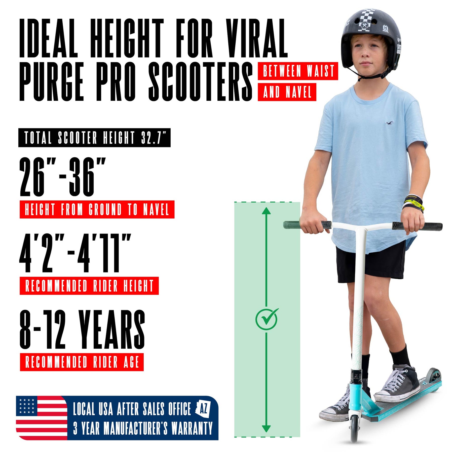Viral Purge Pro Scooter with a handlebar and visible wheels, designed for skatepark use, featuring a durable aluminum deck and aluminum handlebar. Local after sales support.