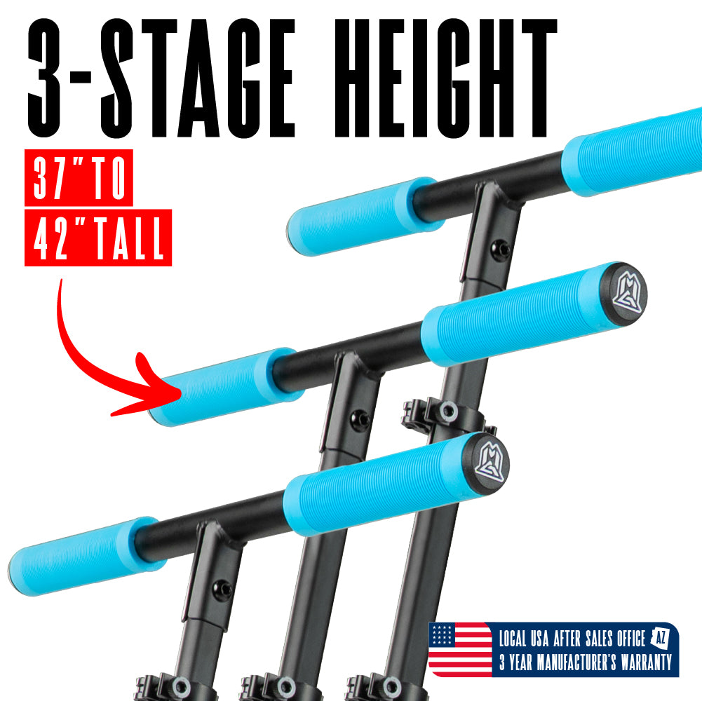 Madd Gear Black and Blue Adjustable Grind Rail in three different angles– Setup View for Scooter Trick Practice